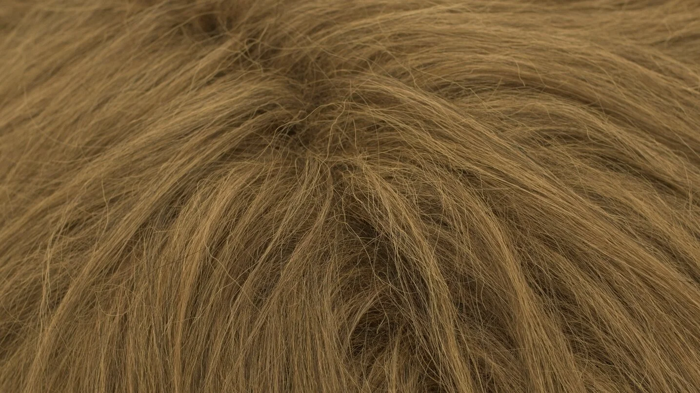 About / A hairy being, or the portion of its form that is visible, is positioned on a low-lying pedestal, in apparent stillness. Upon closer look, the figure is revealed to be active, as rotating elements inside cause it to move restlessly. Low buzzing, cracking, and tearing sounds arise from the actions happening inside.